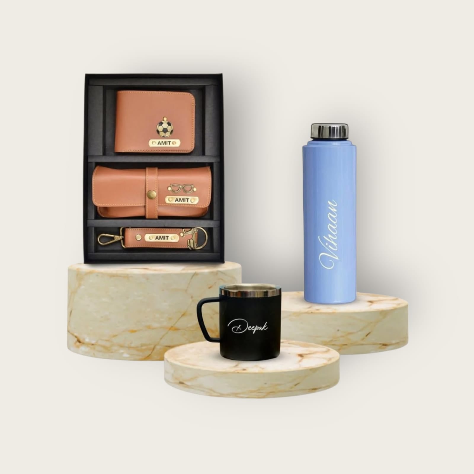 Upgrade your gifting experience with our Luxury 5-in-1 Personalized Combo Set, crafted to make every moment special. This premium combo includes a Wallet, Sunglass Case, Keychain, Bottle, and Mug, each beautifully customised with your Name and Charm. Available in 3 elegant colours, this set is perfect for birthdays, anniversaries, corporate gifting, weddings, and special occasions.